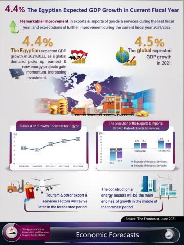 نشر مركز المعلومات ودعم اتخاذ القرار بمجلس الوزراء إنفوجرافيك يتضمن أبرز النقاط التي تناولها تقرير توقعات الإيكونومست حول مصر الصادر في يونيو الماضي إذ يرصد التقرير توقعات إيجابية للاقتصاد المصري حتى العام المالي 2023/ 2024، بعد تخطي العام الأول لجائحة كورونا وتداعياتها السلبية، تصحبها توقعات إيجابية أيضًا لتطور نسب نمو صادرات وواردات السلع والخدمات؛ إذ تتوقع الإيكونومست نمو صادرات السلع والخدمات بمعدل 13.5% في العام المالي الحالي 2021/2022، مقارنةً بمعدل نمو 8.5% في 2020/2021، و -21.7% في 2019/2020. هذا التحسن الملحوظ في صادرات وواردات السلع والخدمات يقود إلى توقعات بمزيد من التحسن خلال العام المالي الحالي 2021/2022، كما أفاد التقرير بأن قطاعي الطاقة والبناء سيظلان هما المحرك الأساسي للاقتصاد في الفترة القادمة، وتوقع أيضًا تعافي قطاعات السياحة، والتصدير، والخدمات الأخرى.