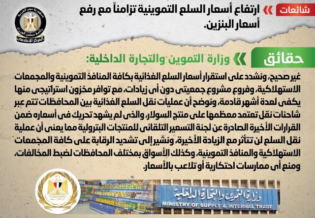انتشر في بعض المواقع الإلكترونية وصفحات التواصل الاجتماعي أنباء بشأن ارتفاع أسعار السلع التموينية تزامناً مع رفع أسعار البنزين، وقد قام المركز الإعلامي لمجلس الوزراء بالتواصل مع وزارة التموين والتجارة الداخلية، والتي نفت تلك الأنباء، مُؤكدةً أنه لا صحة لارتفاع أسعار السلع التموينية تزامناً مع رفع أسعار البنزين، مُشددةً على استقرار أسعار السلع الغذائية بكافة المنافذ التموينية والمجمعات الاستهلاكية، وفروع مشروع جمعيتي دون أي زيادات، مع توافر مخزون استراتيجي منها يكفي لعدة أشهر قادمة، مُوضحةً أن عمليات نقل السلع الغذائية بين المحافظات تتم عبر شاحنات نقل تعتمد معظمها على منتج السولار، والذي لم يشهد تحريك في أسعاره ضمن القرارات الأخيرة الصادرة عن لجنة التسعير التلقائي للمنتجات البترولية مما يعني أن عملية نقل السلع لن تتأثر مع الزيادة الأخيرة، مُشيرةً إلى تشديد الرقابة على كافة المجمعات الاستهلاكية والمنافذ التموينية، وكذلك الأسواق بمختلف المحافظات لضبط المخالفات، ومنع أي ممارسات احتكارية أو تلاعب بالأسعار.