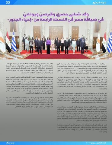 وفي صفحات المجلة تقرأون أيضا عن النسخة الرابعة من المبادرة الرئاسية "إحياء الجذور" للشباب المصري والقبرصي واليوناني، للتأكيد على عمق العلاقات التاريخية والاستفادة من القوى الناعمة المصرية للترويج السياحي ودعم الاستثمار.