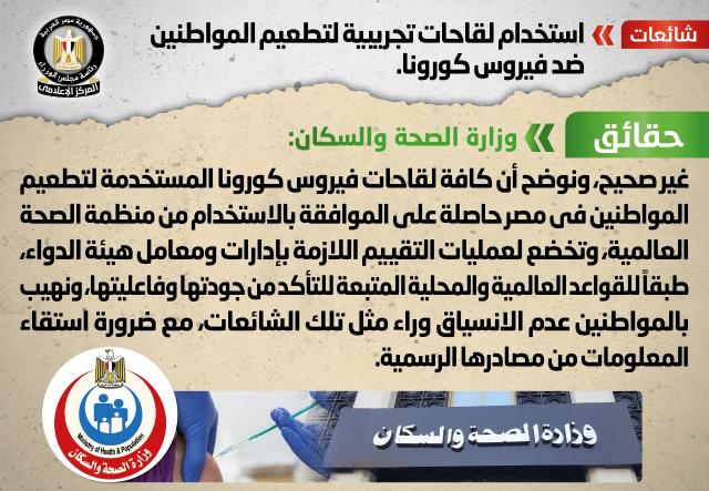 و قام المركز الإعلامي لمجلس الوزراء بالتواصل مع وزارة الصحة والسكان، والتي نفت تلك الأنباء، مؤكدةً أنه لا صحة لاستخدام لقاحات تجريبية لتطعيم المواطنين ضد فيروس كورونا، مُوضحةً أن كافة لقاحات فيروس كورونا المستخدمة لتطعيم المواطنين في مصر حاصلة على الموافقة بالاستخدام من منظمة الصحة العالمية، وتخضع لعمليات التقييم اللازمة بإدارات ومعامل هيئة الدواء، طبقاً للقواعد العالمية والمحلية المتبعة للتأكد من جودتها وفاعليتها، مُهيبةً بالمواطنين عدم الانسياق وراء مثل تلك الشائعات، مع ضرورة استقاء المعلومات من مصادرها الرسمية.