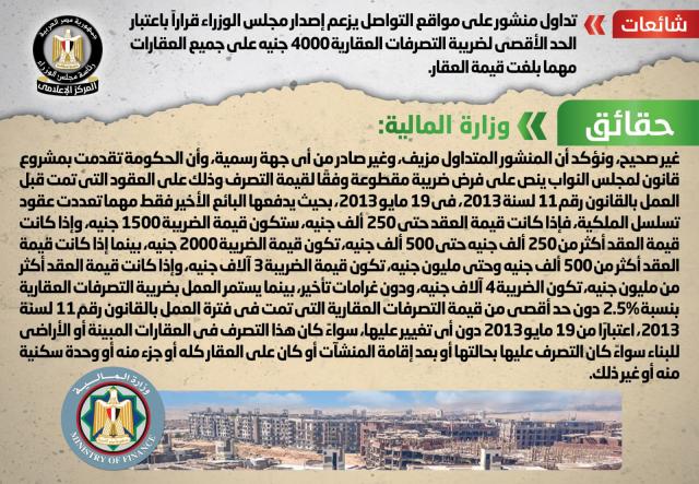 تداولت بعض وسائل الإعلام والمواقع الإلكترونية وصفحات التواصل الاجتماعي منشوراً يزعم إصدار مجلس الوزراء قراراً باعتبار الحد الأقصى لضريبة التصرفات العقارية ٤٠٠٠ جنيه على جميع العقارات مهما بلغت قيمة العقار، وقد قام المركز الإعلامي لمجلس الوزراء بالتواصل مع وزارة المالية، والتي نفت تلك الأنباء، مُؤكدةً أنه لا صحة لإصدار مجلس الوزراء قراراً باعتبار الحد الأقصى لضريبة التصرفات العقارية ٤٠٠٠ جنيه على جميع العقارات مهما بلغت قيمة العقار، مُشددةً على أن المنشور المتداول مزيف، وغير صادر من أي جهة رسمية، وأن الحكومة تقدمت بمشروع قانون لمجلس النواب ينص على فرض ضريبة مقطوعة وفقًا لقيمة التصرف وذلك على العقود التي تمت قبل العمل بالقانون رقم ١١ لسنة ٢٠١٣، في ١٩ مايو ٢٠١٣، بحيث يدفعها البائع الأخير فقط مهما تعددت عقود تسلسل الملكية، فإذا كانت قيمة العقد حتى ٢٥٠ ألف جنيه، ستكون قيمة الضريبة ١٥٠٠ جنيه، وإذا كانت قيمة العقد أكثر من ٢٥٠ ألف جنيه حتى ٥٠٠ ألف جنيه، تكون قيمة الضريبة ٢٠٠٠ جنيه، بينما إذا كانت قيمة العقد أكثر من ٥٠٠ ألف جنيه وحتى مليون جنيه، تكون قيمة الضريبة ٣ آلاف جنيه، وإذا كانت قيمة العقد أكثر من مليون جنيه، تكون الضريبة ٤ آلاف جنيه، ودون غرامات تأخير، بينما يستمر العمل بضريبة التصرفات العقارية بنسبة ٢,٥٪ دون حد أقصى من قيمة التصرفات العقارية التي تمت فى فترة العمل بالقانون رقم ١١ لسنة ٢٠١٣، اعتبارًا من ١٩ مايو ٢٠١٣ دون أى تغيير عليها، سواءً كان هذا التصرف في العقارات المبينة أو الأراضي للبناء سواءً كان التصرف عليها بحالتها أو بعد إقامة المنشآت أو كان على العقار كله أو جزء منه أو وحدة سكنية منه أو غير ذلك.