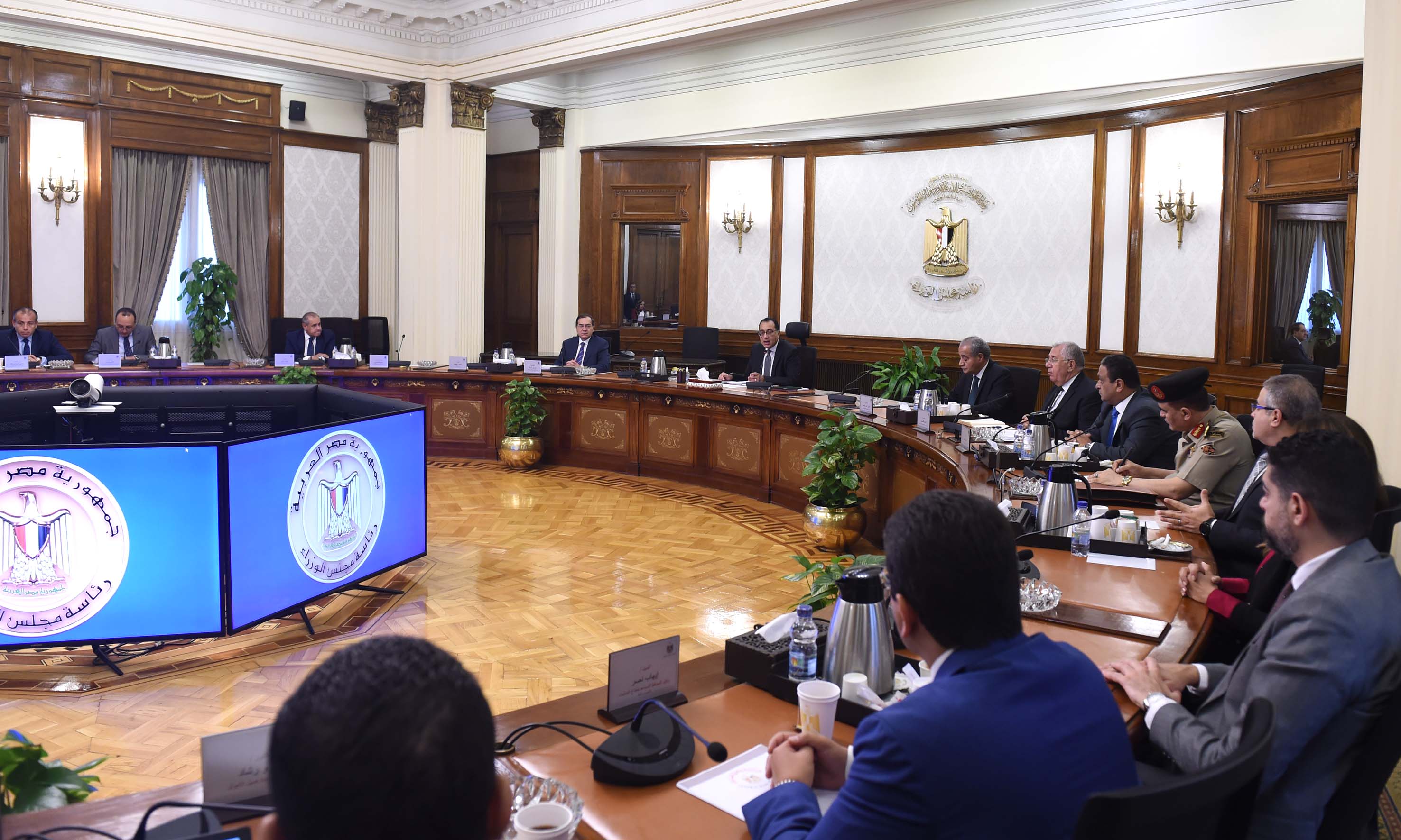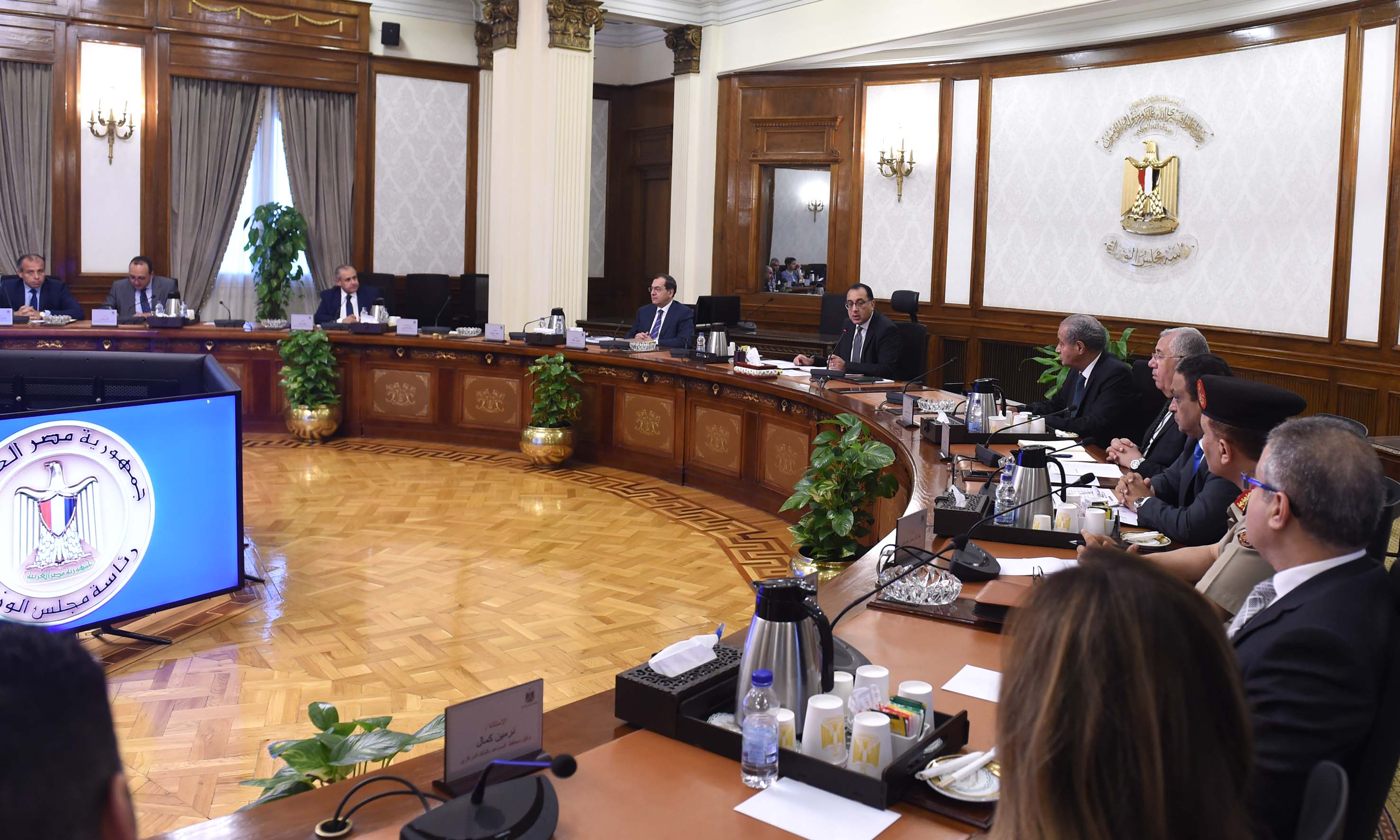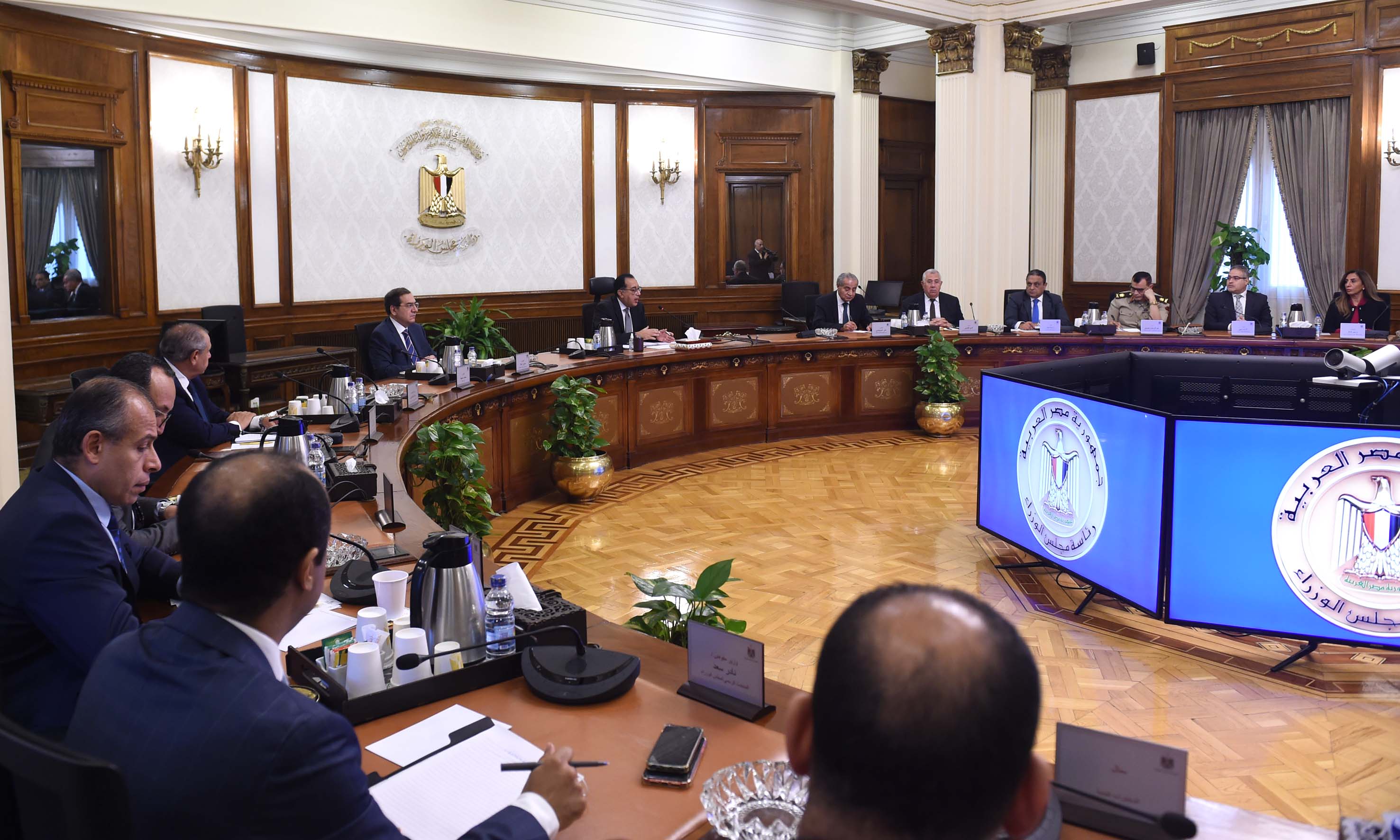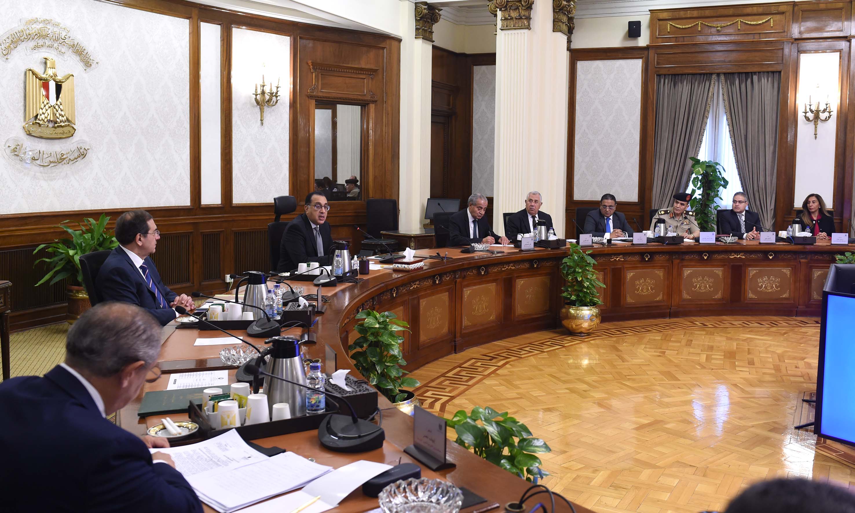وتطرق الدكتور مصطفى مدبولي، خلال الاجتماع، إلى توجيهات الرئيس عبد الفتاح السيسي، رئيس الجمهورية، فيما يتعلق بجهود زيادة رقعة الأراضى الزراعية على مستوى الجمهورية، تحقيقا للاكتفاء الذاتي من مختلف المحاصيل الاستراتيجية، هذا إلى جانب ما يتعلق بالاهتمام بملف الصناعة وتوفير مدخلات الانتاج لمختلف القطاعات، دعما وتعزيزا لدور الصناعة المحلية، مشيراً إلى أن العمل بمزيد من الجهد والتكامل فى مثل هذه الملفات من شأنه التخفيف من حدة وآثار الأزمة العالمية الحالية، فضلا عن مساهمة ذلك فى تحقيق المزيد من معدلات النمو الاقتصادى المرجو، تعظيماً لما تمتلكه مصر من مقومات وامكانات.
