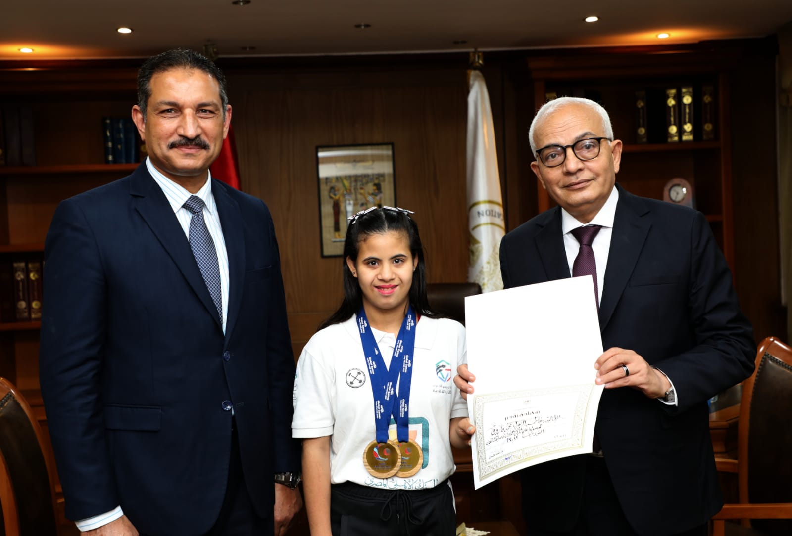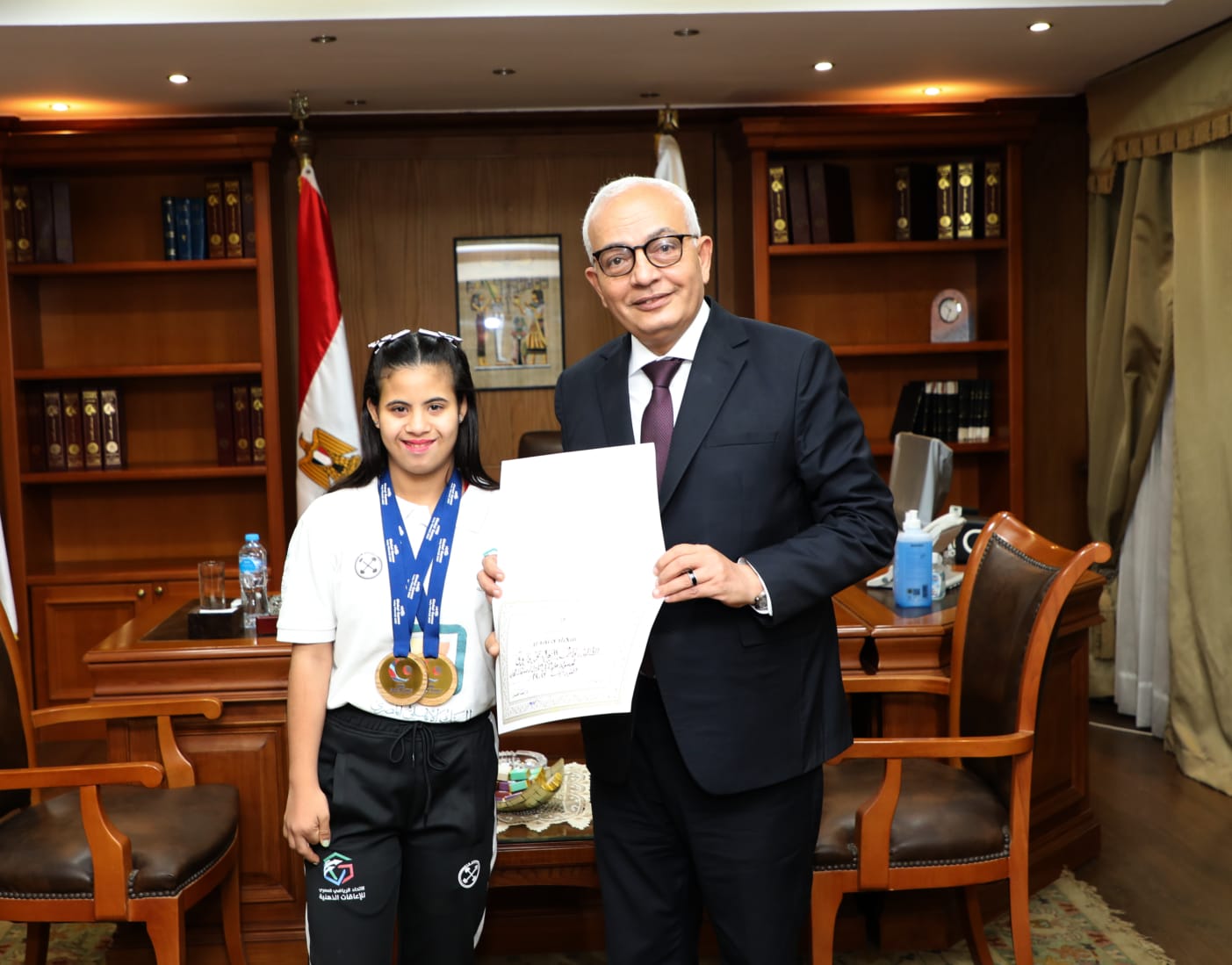 وزير التربية والتعليم يكرم أسرع عداءة «داون» في مصر توجت بذهبيتين بمونديال فرنسا