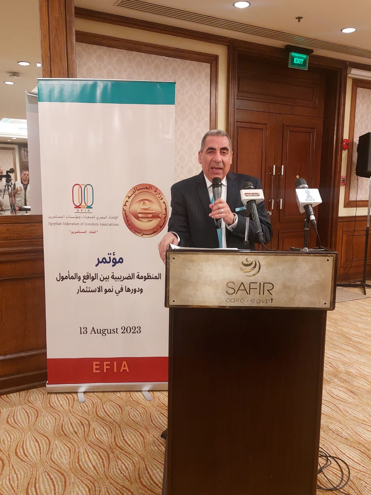 جاء ذلك خلال مؤتمر " المنظومة الضريبية بين الواقع والمأمول ودورها في نمو الاستثمار" الذي عقده الاتحاد المصري لجمعيات ومؤسسات المستثمرين " اتحاد المستثمرين " بالتعاون مع مصلحة الضرائب المصرية بحضور أعضاء مجلس إدارة الاتحاد ورؤساء جمعيات المستثمرين ، ومن جانب مصلحة الضرائب المصرية الدكتور السيد محمود صقر نائب رئيس مصلحة الضرائب المصرية، ورشا عبد العال نائب رئيس مصلحة الضرائب المصرية، والدكتور إبراهيم عبد الحليم رئيس قطاع البحوث الضريبية، والدكتور اشرف الزيات رئيس مركز كبار الممولين ، والدكتور معوض خليل رئيس الإدارة المركزية لشئون مكتب رئيس مصلحة الضرائب المصرية، وعاطف حمدي رئيس مأمورية ضرائب الشركات المساهمة ، وعدد من قيادات مصلحة الضرائب.