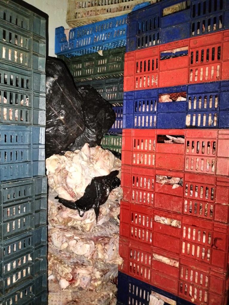 صرح الدكتور إيهاب صابر رئيس الهيئة العامة للخدمات البيطرية أنه وردت معلومات بوجود ثلاجة بأحد الحقول الزراعية بناحية زواية ابو مسلم مركز ابوالنمرس وتتخذ موقعا لتخزين وفرم هياكل الدواجن ومخلفات مجازر ودهون حيوانية وتم التنسيق مع مباحث التموين وتحت إشراف الدكتور علاء عبدالعال احمد مدير مديرية الطب البيطري بالجيزة حيث داهمت اللجنة المشتركة من أطباء التفتيش بمديرية الطب البيطري وقوة مباحث التموين الثلاجة ليلا وتم ضبط 10 طن من هياكل دواجن ومفروم دواجن ودهون حيوانية غير صالحة للاستهلاك الادمي وتم ضبط المتهمين وتحرير محضر بالواقعة وإحالة الي النيابة العامة لمباشرة التحقيق وتم ضبط معدات مفارم للغش التجاري وتجهيز مصنعات لحوم.