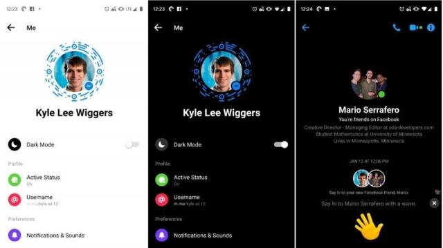 حصلت منصة ماسنجر بشكل اختياري على الوضع الداكن، وذلك بعد أن أضافت شركة فيسبوك خيارًا إلى قائمة إعدادات تطبيق المراسلة يتيح الحصول على الوضع الداكن، ويجري نشر هذه الميزة على مستوى العالم، مما يسمح بحصول 1.3 مليار شخص يستخدمون ماسنجر عليها.