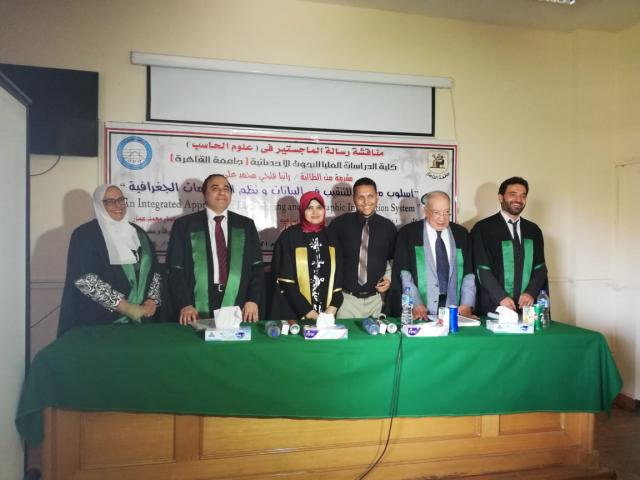 وأ.د/ لمياء فتوح إبراهيم – (رئيس قسم علوم الحاسب بالكليه) عضوا ومحكما و د/ أكرم إبراهيم صلاح – (كلية الحاسبات والمعلومات) عضوا محكما ، و د/عمار محمد عمار عضوا و مشرفا ، درجة الماجستير والتى جاءت بعنوان "أسلوب متكامل للتنقيب في البيانات ونظم المعلومات الجغرافية" .