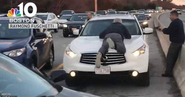 وفي بيان قالت الشرطة إن سيارة إنفنيتي كانت تسير بسرعة 112 كيلومتر في الساعة ثم تتوقف، ثم تعود وتتسارع، لكن الرجل لم يترجل عن غطاء المحرك.